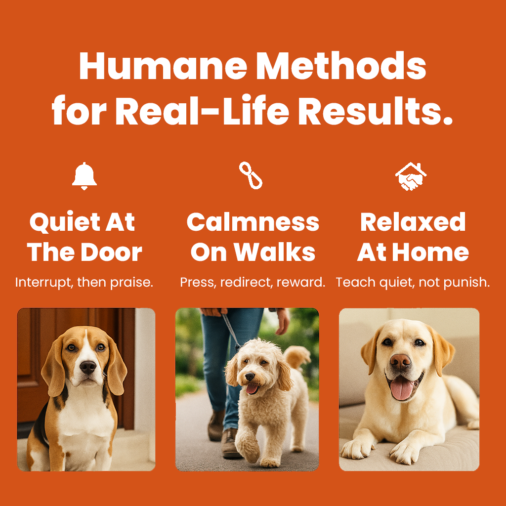 Barking, jumping, chasing, door dashing, chewing, and digging—so you can quickly cue calm and refocus.