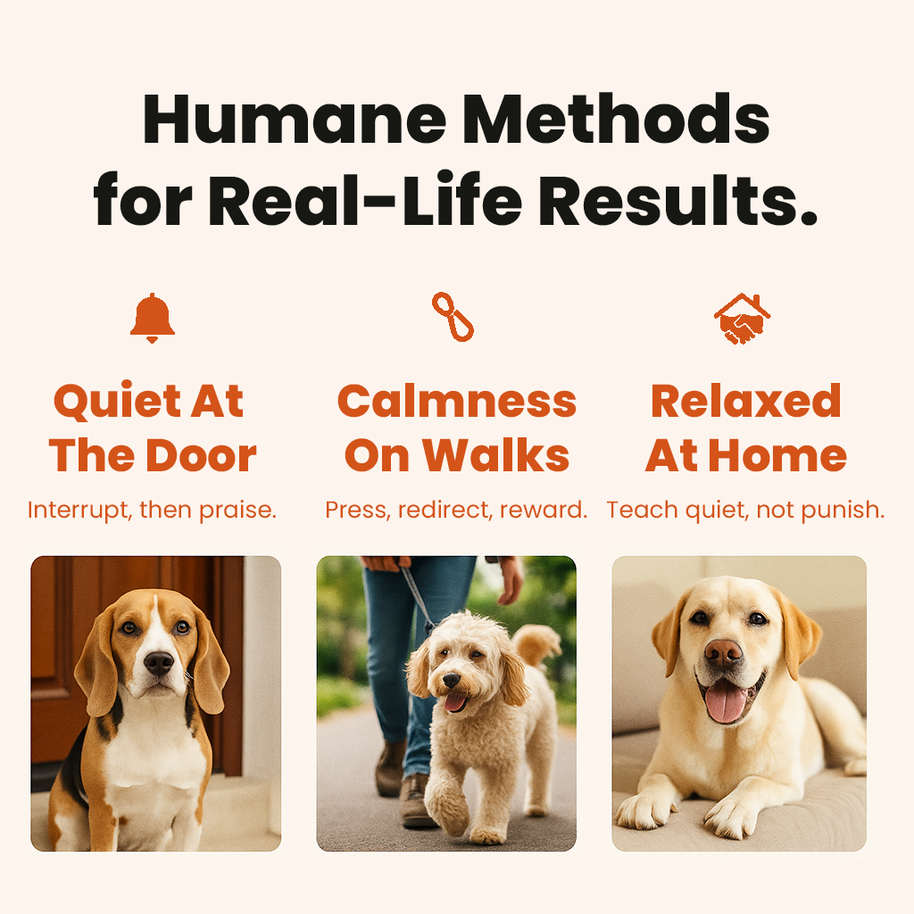 You’re juggling kids, dinner, and the dog. You don’t need a new hobby—you need a reliable pause button that helps you reinforce calm. QuietCue interrupts the spiral so you can mark “Yes!” and treat. It’s humane, fast, and simple.